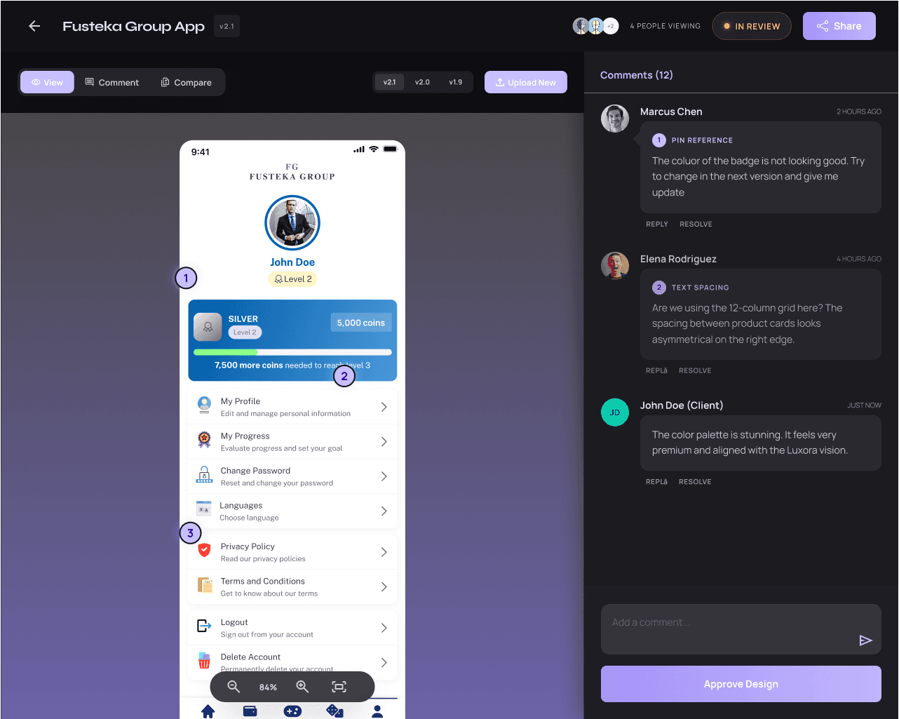 Status colors are semantic throughout: amber for "in review," green for approved, red for rejected. Nothing is ambiguous. The pinpoint comment system — where clients click directly on a design to drop a numbered pin — was the core interaction, so it got the most attention in terms of hierarchy, hover states, and feedback.