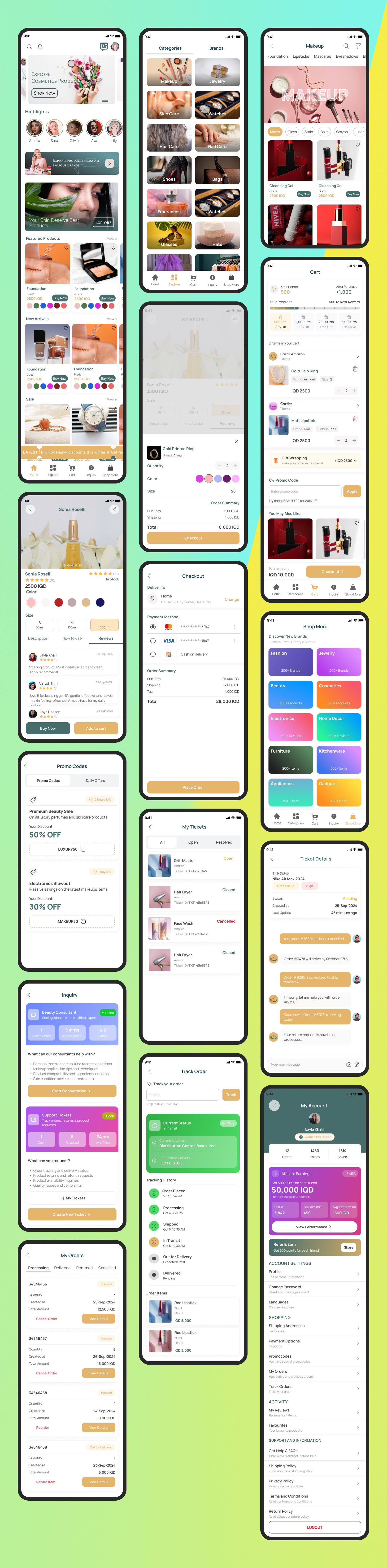 A full-featured e-commerce and cosmetics marketplace app designed for Basra, Iraq — featuring AI chat assistance, multi-brand browsing, smart search with camera, cart management, order tracking, and an affiliate program. Built entirely in Figma as a comprehensive mobile-first shopping experience.